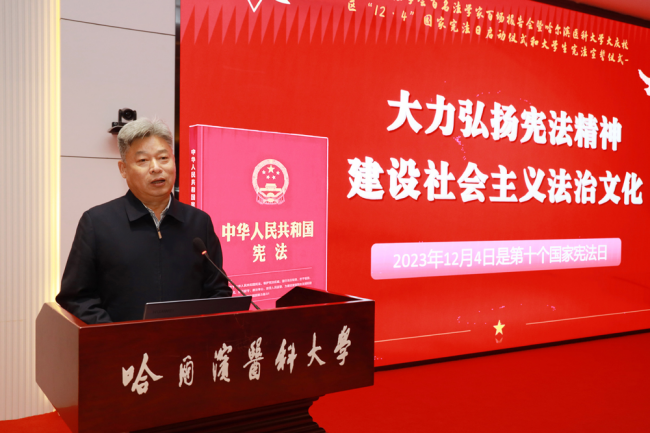 11月28日下午,在哈尔滨医科大学大庆校区图书馆一楼报告厅,举行法治文化基层行暨哈医大大庆校区“12·4”国家宪法日专题讲座和大学生宪法宣誓活动。哈医大大庆校区党委副书记李国军、市法学会卫生法学研究会会长李雅荣、市法学会专职副会长李莉、哈医大大庆校区思政部主任于美军及2021级信息管理与信息系统(医学文秘)和2022级健康服务与管理专业学生参加活动。